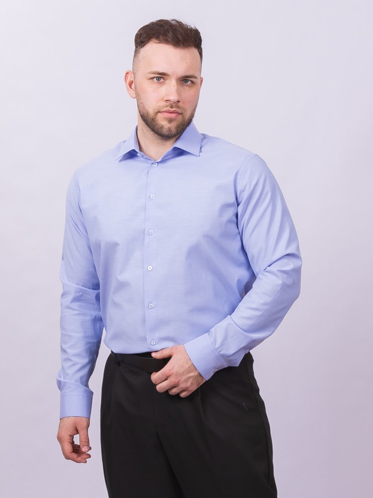 Рубашка изготовлена из 55% хлопка и 45% полиэстера, что обеспечивает приятные тактильные ощущения и долговечность изделия. Прямой крой не облегает фигуру и визуально делает плечи шире, идеально подходя для делового дресс-кода.