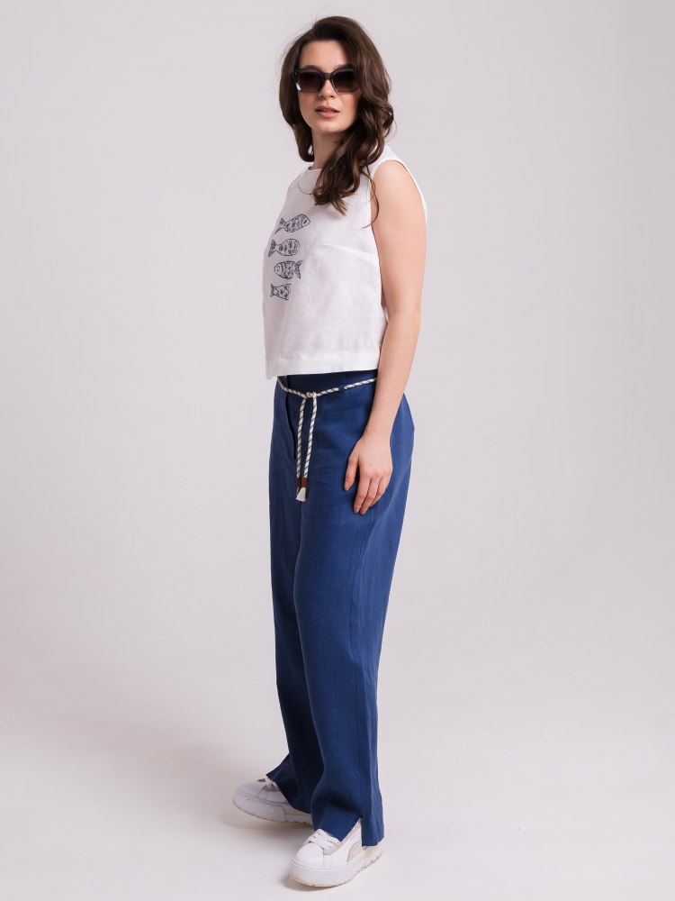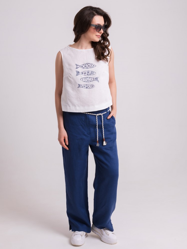 Комфортная, стильная, лёгкая льняная блузка женская из 53% хлопка и 47% натурального белорусского льна. Топ свободный укороченный с принтом не сковывает движения. Отлично сочетается с любым предметом гардероба.